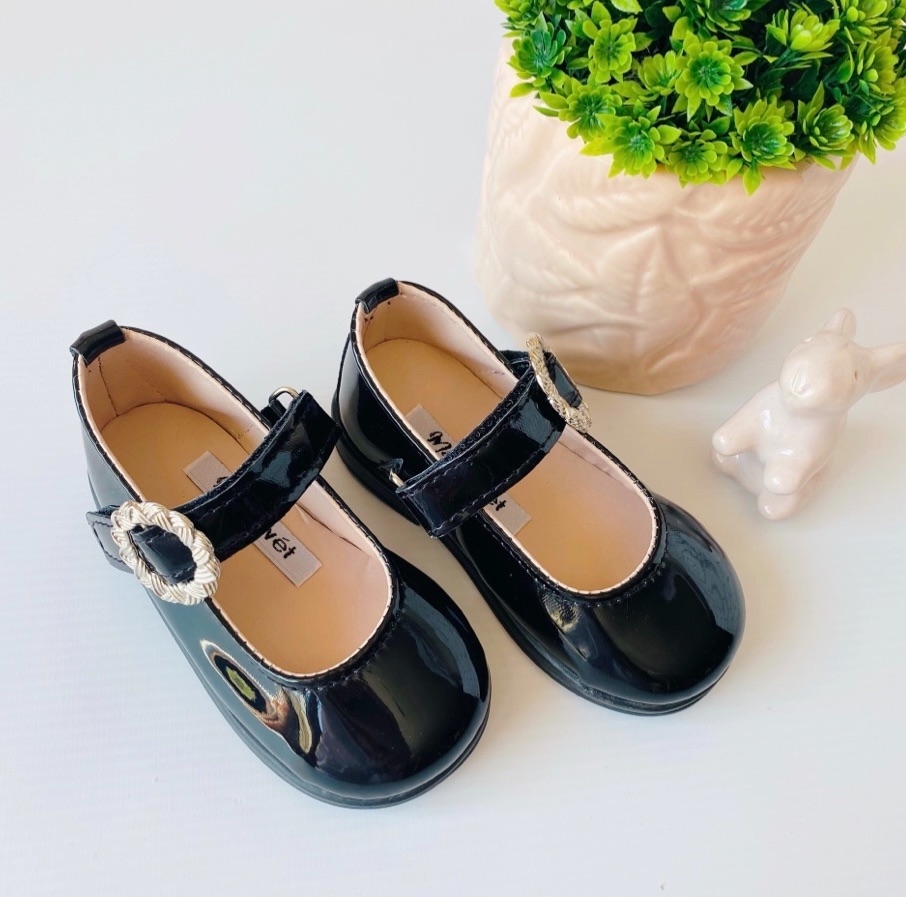 Sandalia negra en charol con hebilla metalica, apertura con velcro . Este modelo es para caminante