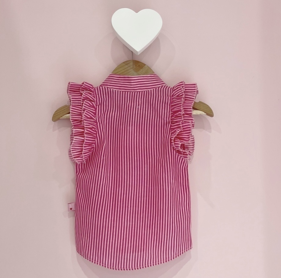 Camisa rayada con volados en mangas, abotonada con corazones. En poplin.
