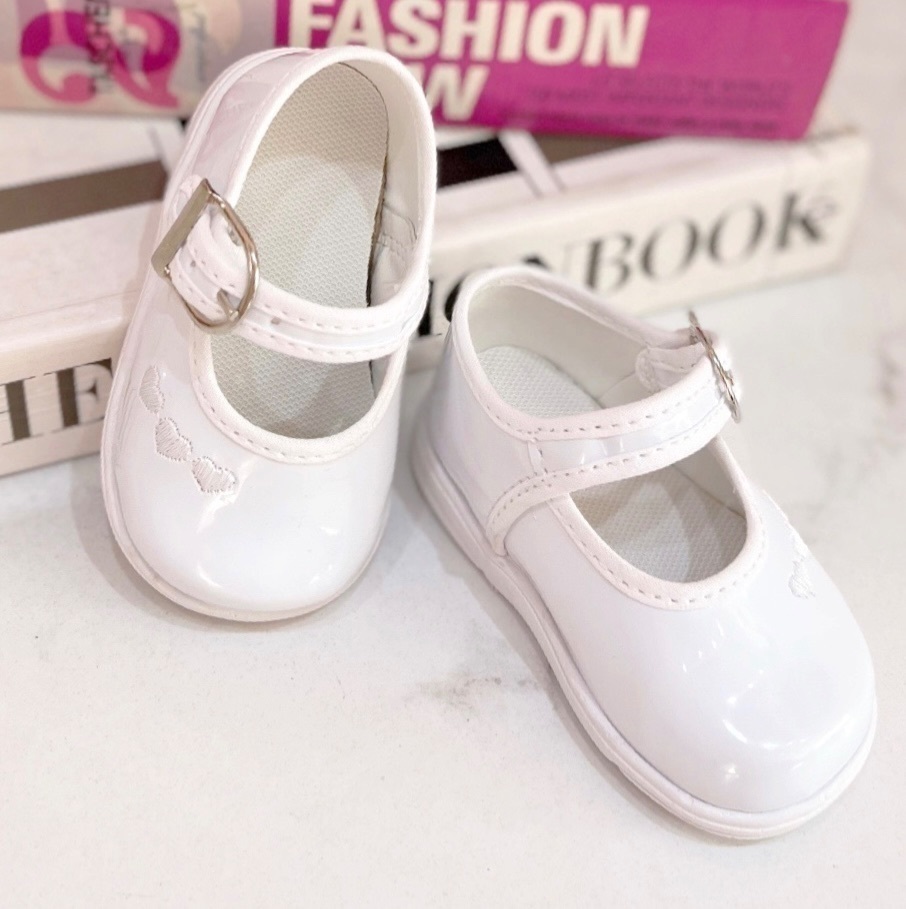 ENTREGAS A PARTIR DEL 15 DE NOVIEMBRE Sandalia blanca en charol con hebilla y bordado de corazones. Este modelo es para caminante
