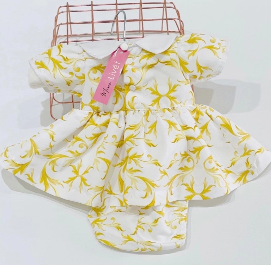 Vestido/body Isabella. La tela es plana y el corte holgado.Tela polin y microfibra estampada. Diseño de estampa exclusivo de Mini livét. Viene con bombacha incorporada con elástico y broche snap para poder cambiar el pañal, y apertura trasera con broche snap y botón oculto en cuellito. Desde recién nacida hasta 2-3 años. La modelo tiene 5 añitos y esta usando un talle 24- 36 meses.