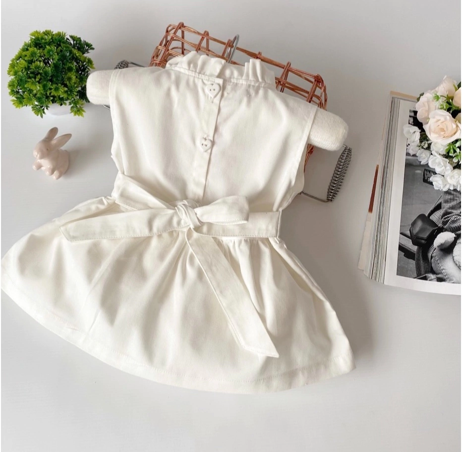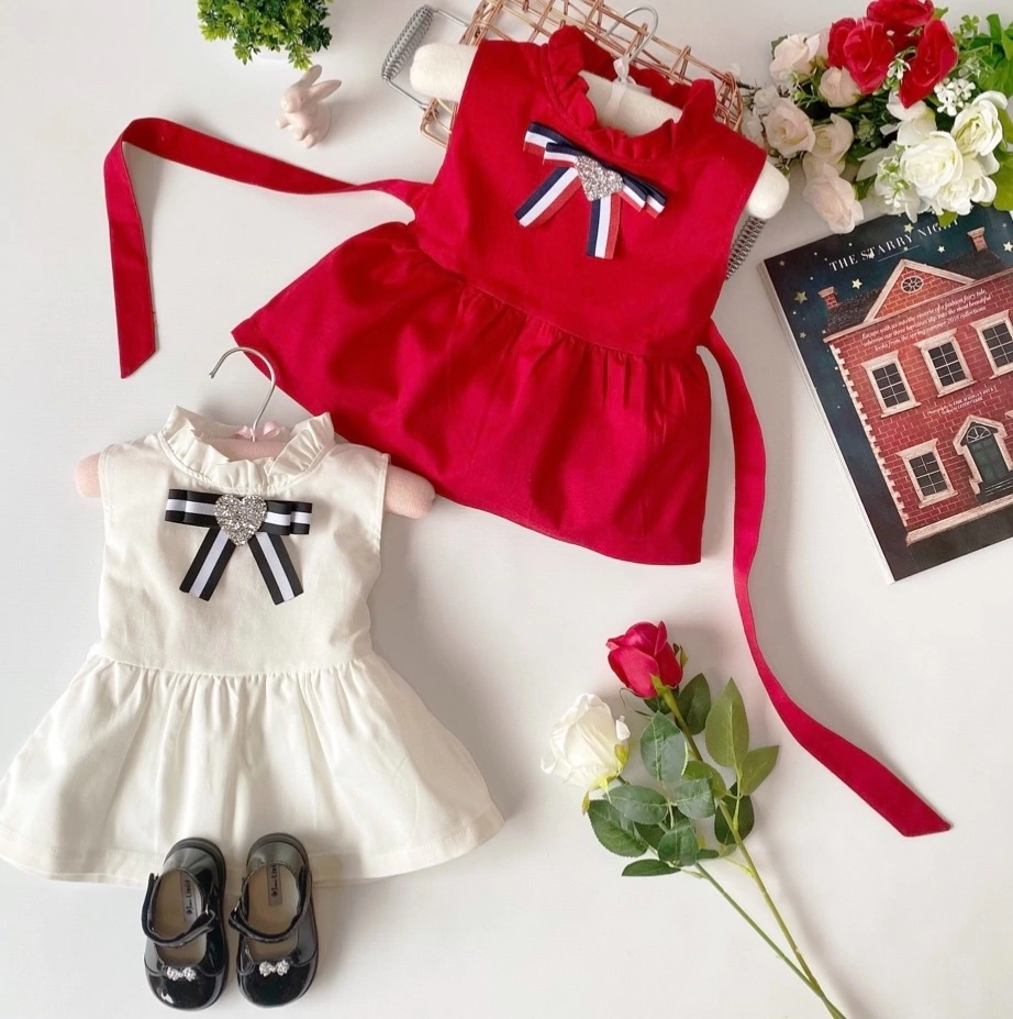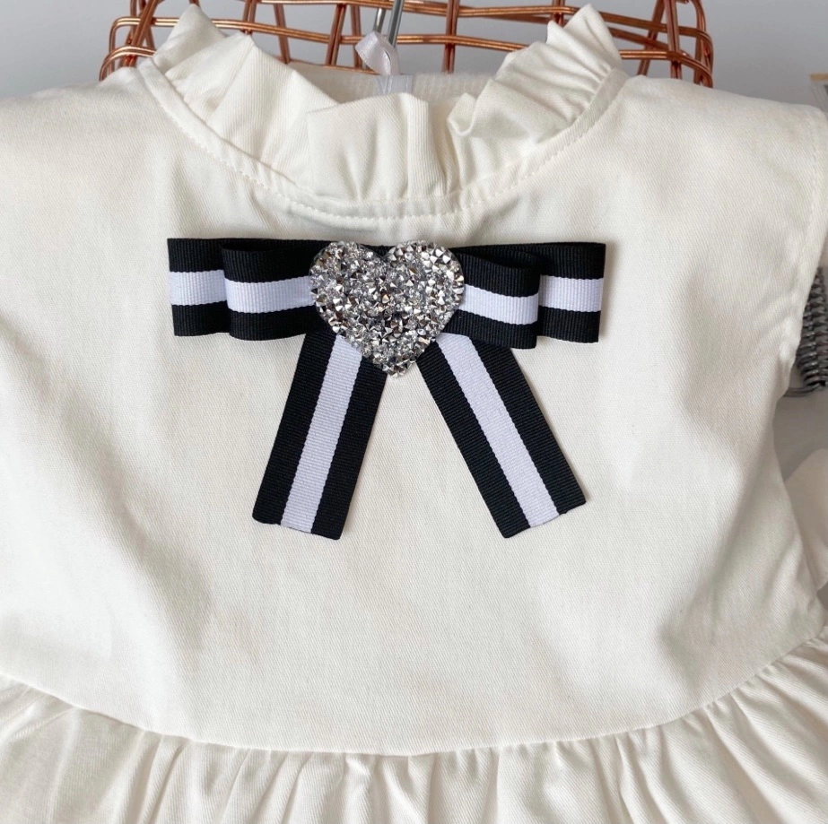 Vestido de gabardina con aplique de moño y corazón strass, botones en la espalda y lazo en cintura.